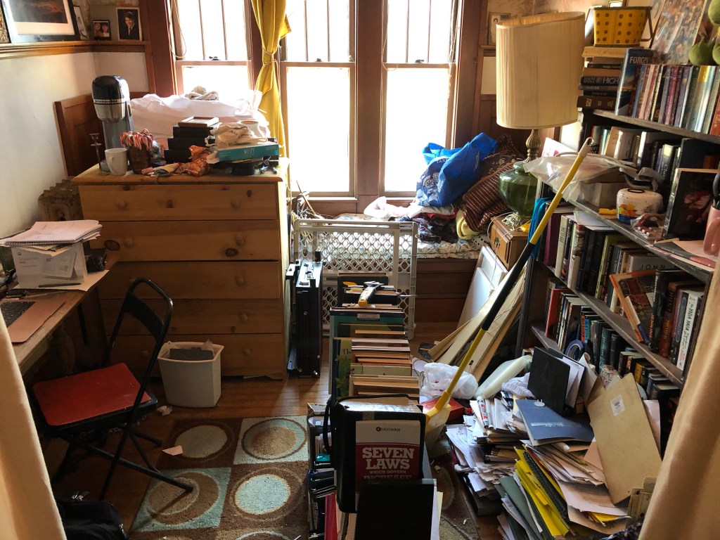 I’ve been working on this for two days. You wouldn’t believe how much I’ve thrown away. The pile on the right next to the bookcase is next.