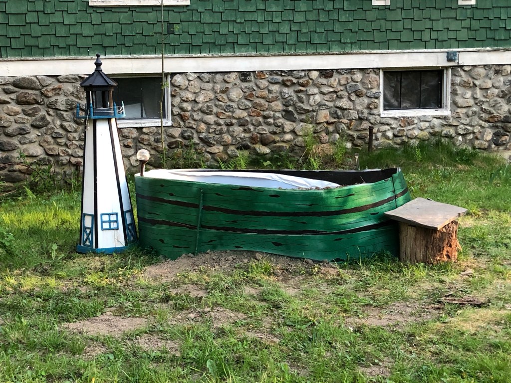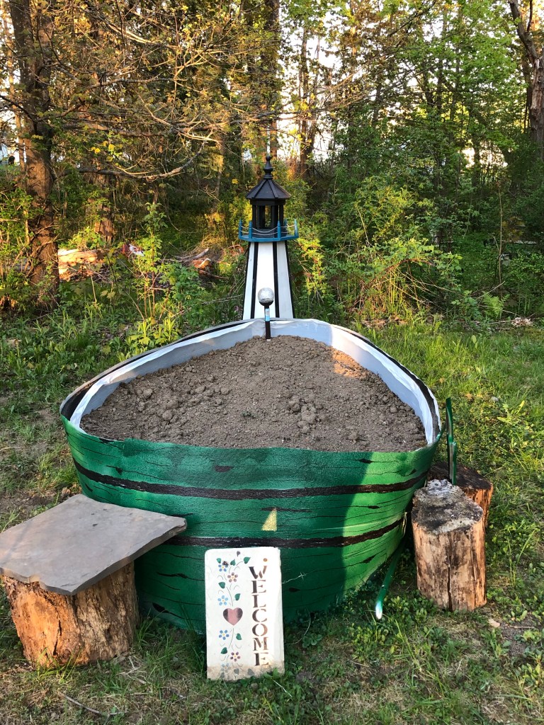 I call myself an intuitive gardener or an experimental gardener. Most people just call me nuts. My family has learned to make the best out of my “experiments”. This bed is made of recycled waterproofing material. Brenda saw a boat and so she has painted it as such. We shall call this “The Ocean-side Garden.”
